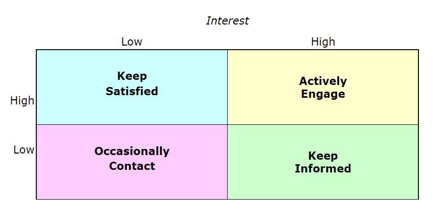 UKRI suggests using tools like an interest-influence grid to assess your contacts, like the one provided below by Changing Minds.